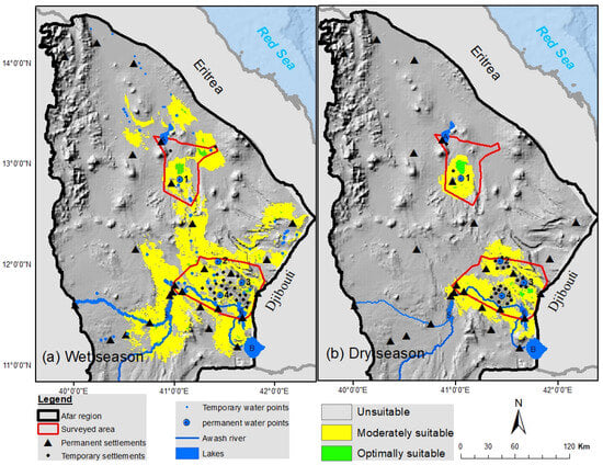 Distance from human settlements plays a crucial role, as the African wild ass tend to avoid areas with high human and livestock densities, possibly due to the risks of hunting and competition for resources [73]. Distance from the settlement had a lower contribution during the wet season. This may indicate that competition for water and forage is reduced as there is more widespread availability of water and forage so the African wild ass can maintain their distance (1–2 km) from livestock and (3–6 km) from local settlements (Figure 4a). Pastoralists and their livestock also utilize areas that the African wild ass inhabit [2], and may compete for forage as well as water [10]. Competition for water is high when people and livestock are more concentrated around the permanent water sites in the dry season [3,77]. The important contribution that distance from settlements makes in our dry season model indicates more competition with livestock for water as also reported in other studies [73] (Figure 4b). The prevalence of more water and forage could attract livestock and increase the competition during the wet season, which may lead to smaller optimum habitat for seasonal modeling [78,79]. Compared to the above predictor variables (e.g., distance from water, precipitation, and distance from settlement), herbaceous grassland cover and slope contributed minimally in both seasons. This relative minimal contribution could be due to the nature of scarce vegetation cover in the Danakil and the species’ ability to move across rugged terrain whenever required (Figure 5). This is also observed on other desert ungulates as their movement allows them to forage a vast area and this mobility reduces their dependency on the vegetation cover at a fixed location [80]. The other reason could be that access to water and avoidance of human disturbance is prioritized over forage abundance in habitat selection [81,82]. This result is consistent with findings by Kebede et al. [14], who also found that topography and vegetation type were less significant compared to water availability and human presence. The African wild ass is highly adaptable to various terrain types and can thrive in open plains or rugged terrain as long as water and forage are accessible [77]. Their ability to use a wide range of habitats due to physiological adaptation allows them to persist in a very arid ecosystem, such as the Danakil Depression [83,84].