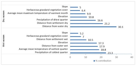 Distance from water, distance from settlement, and precipitation of the driest quarter were the most important predictor variables showing the highest percentage contribution during the dry season (Figure 5). Whereas, in the wet season, precipitation of the coldest quarter, mean temperature of the wettest quarter, and the distance from water scored a higher percentage contribution. Conversely, herbaceous cover and slope scored a lower percentage contribution to both seasons’ modeling (Figure 5).