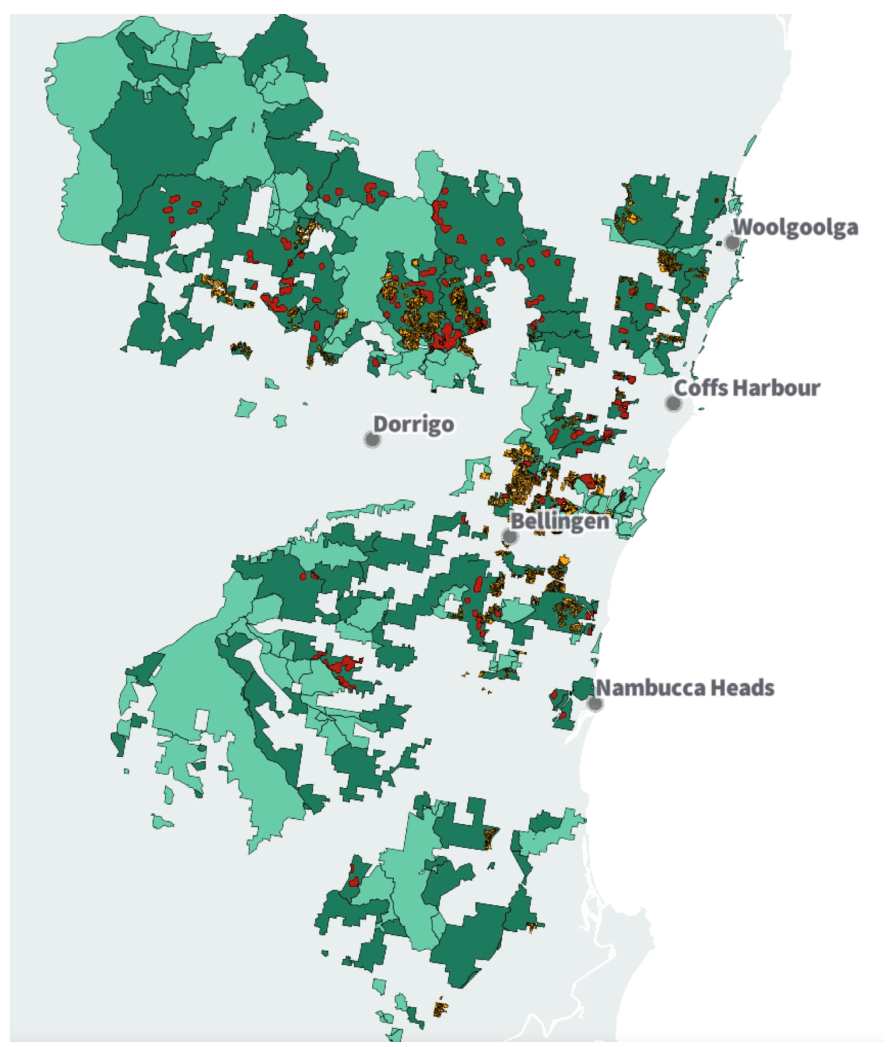 Figure 2. Proposed Great Koala National Park—Mid North Coast of NSW. Sources: creative commons imagery using NSW Government data provided by the authors and generated via OpenMapTiles and Open Street Map [2,4]. Light green indicates existing national parks; dark green, state forests; red, koala hubs; yellow, plantations.