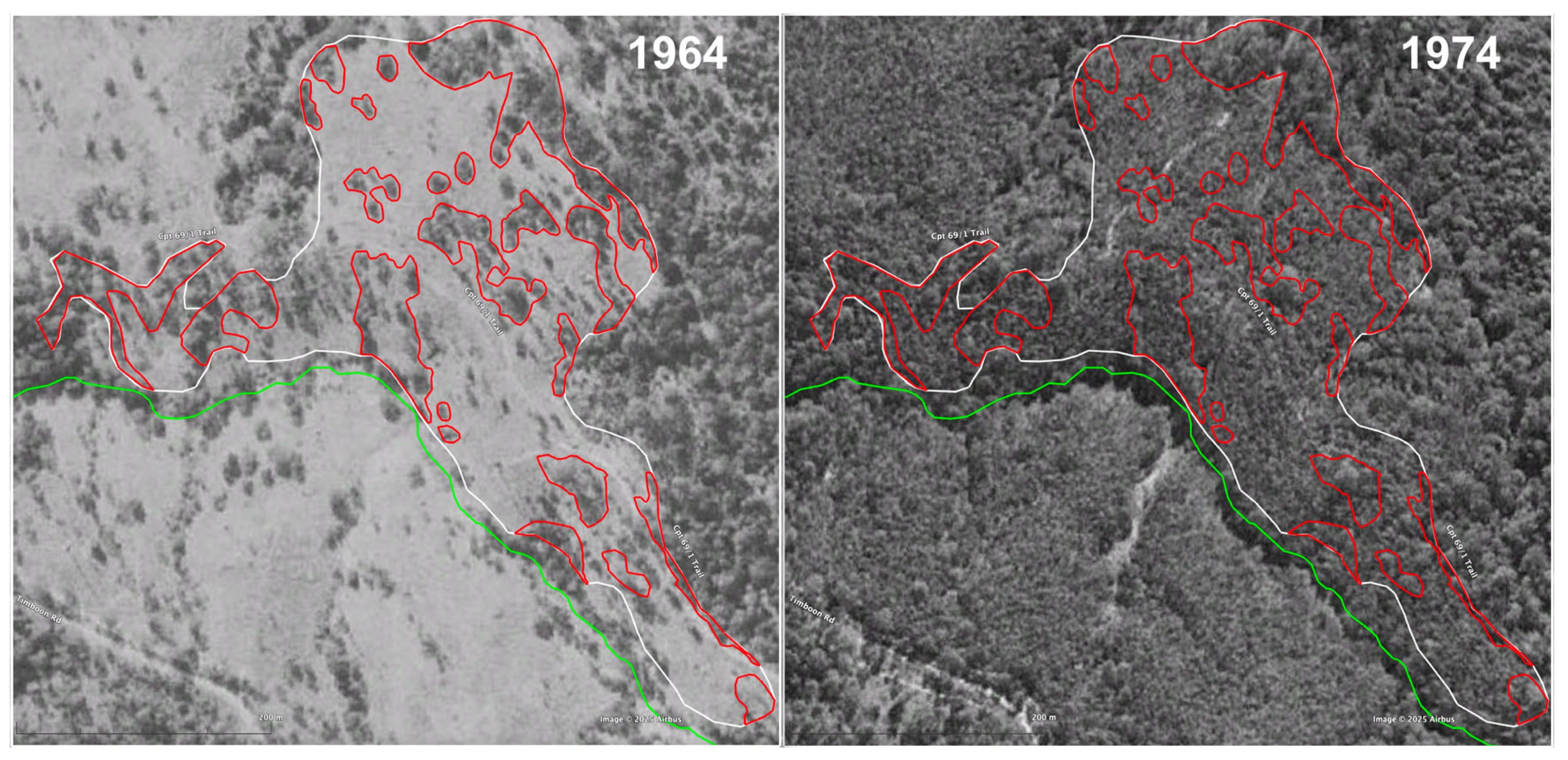 The degree of precision of the ortho-mosaics generated from historical aerial photography may not always be absolute due to flaws in base imagery, such as scratches or spots, and changes to ground controls (such as boundaries). In cases of large batch image processing, this can lead to compounding errors [34]. This was not a problem here as few images were involved; however, the authors have now created imagery for the entire State Forest of the proposed GKNP, and this involved hundreds of images. Errors can be offset by ground-based verification, which was central to this project as part of the collection of tree data. However, the cost in time (and money) associated with the creation of georeferenced imagery may preclude the use of tree-date collection. Here, automated processes, which are now maturing and producing accurate results, may be a consideration in the future [35]. Such processes may be applicable to individual trees as well. Whatever the solution to the time–labour cost, FCNSW should consider allocating its own resources to this work rather than outsourcing it to the scientific community and citizen scientists.