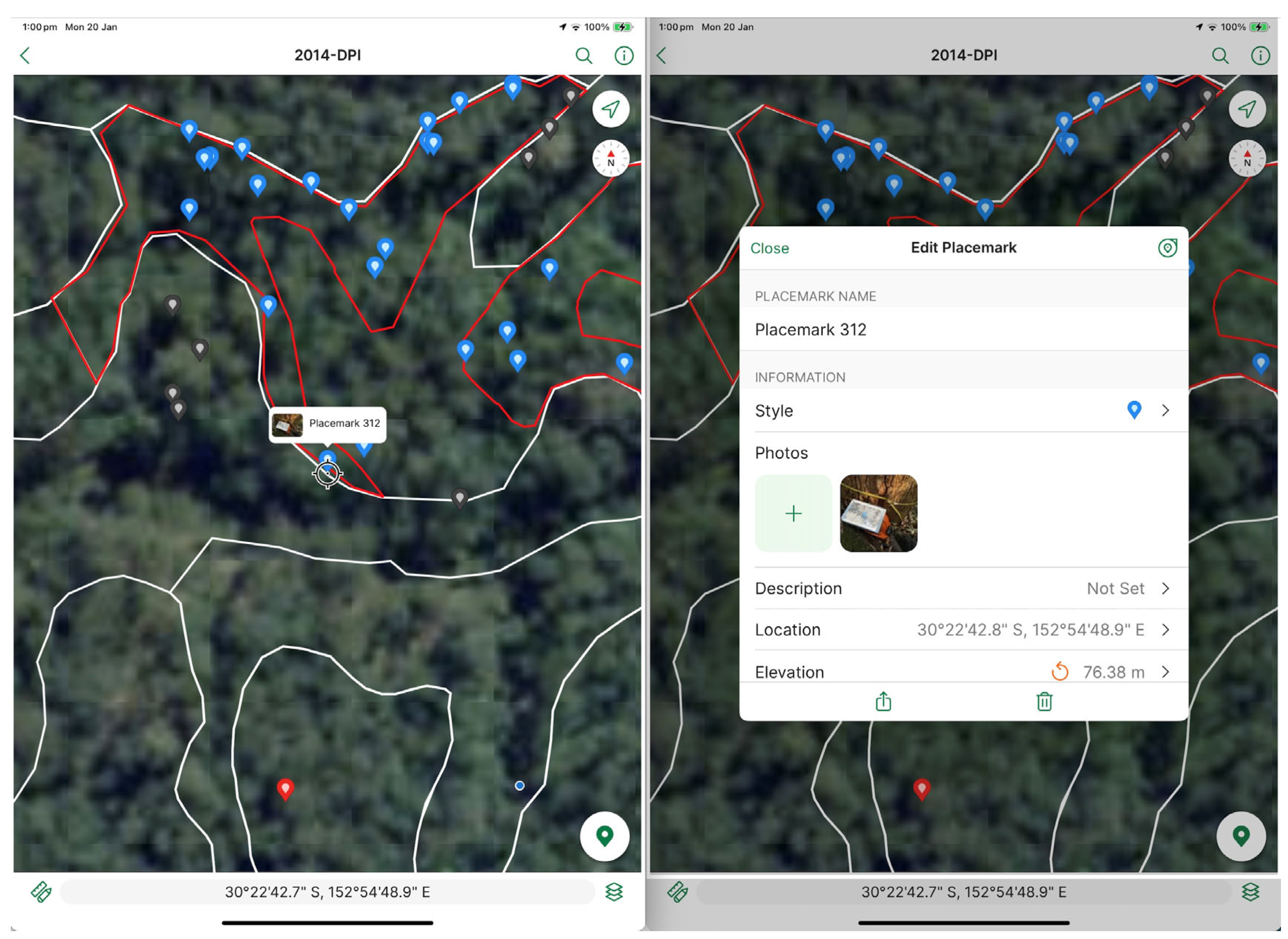 Figure 7. Record of tree on the Avenza app: on the left, as a placemark; on the right, with metadata displayed showing the tree’s location on the map and the actual tree (NSW Government).