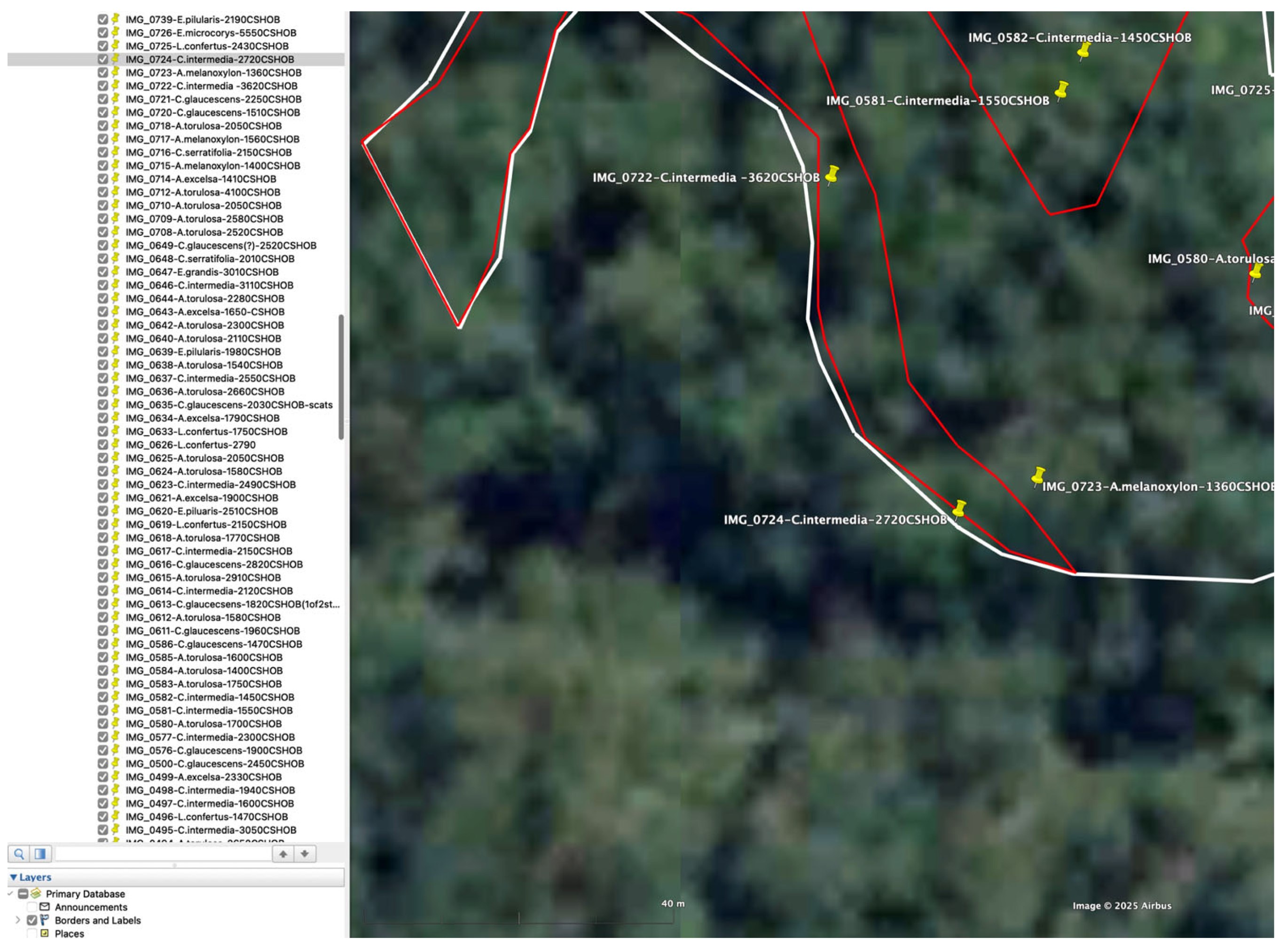 Coordinates from both devices were cross-checked. Rainforest trees under 1500 mm in circumference were generally not recorded, unless uncommon (e.g., Ringwood/Aniseed myrtle Syzygium anisatum) or an important exemplar of native vegetation in a given location. This approach was also applied to Forest oak (Allocasuarina torulosa) and Pink bloodwood (Corymbia intermedia), both non-plantation species, found on the margins of native forest and rainforest. Measurements for Eucalyptus spp. were generally over 2500 mm CSHOB; records were taken of eucalypt species with smaller circumferences if they were part of a larger remnant or an individual, non-plantation species within a plantation (i.e., not planted). If identified, plantation tree species were avoided (see caveats below). These images were subsequently exported into GEP, with image number, species (where identifiable), and CSHOB adding to a central database, or record of trees (Figure 8). These were checked against the historical image layers, and the polygons were amended, if necessary, to create a more accurate delineation of the forest remnants. Individual original trees were also plotted. See the Section 3 below.