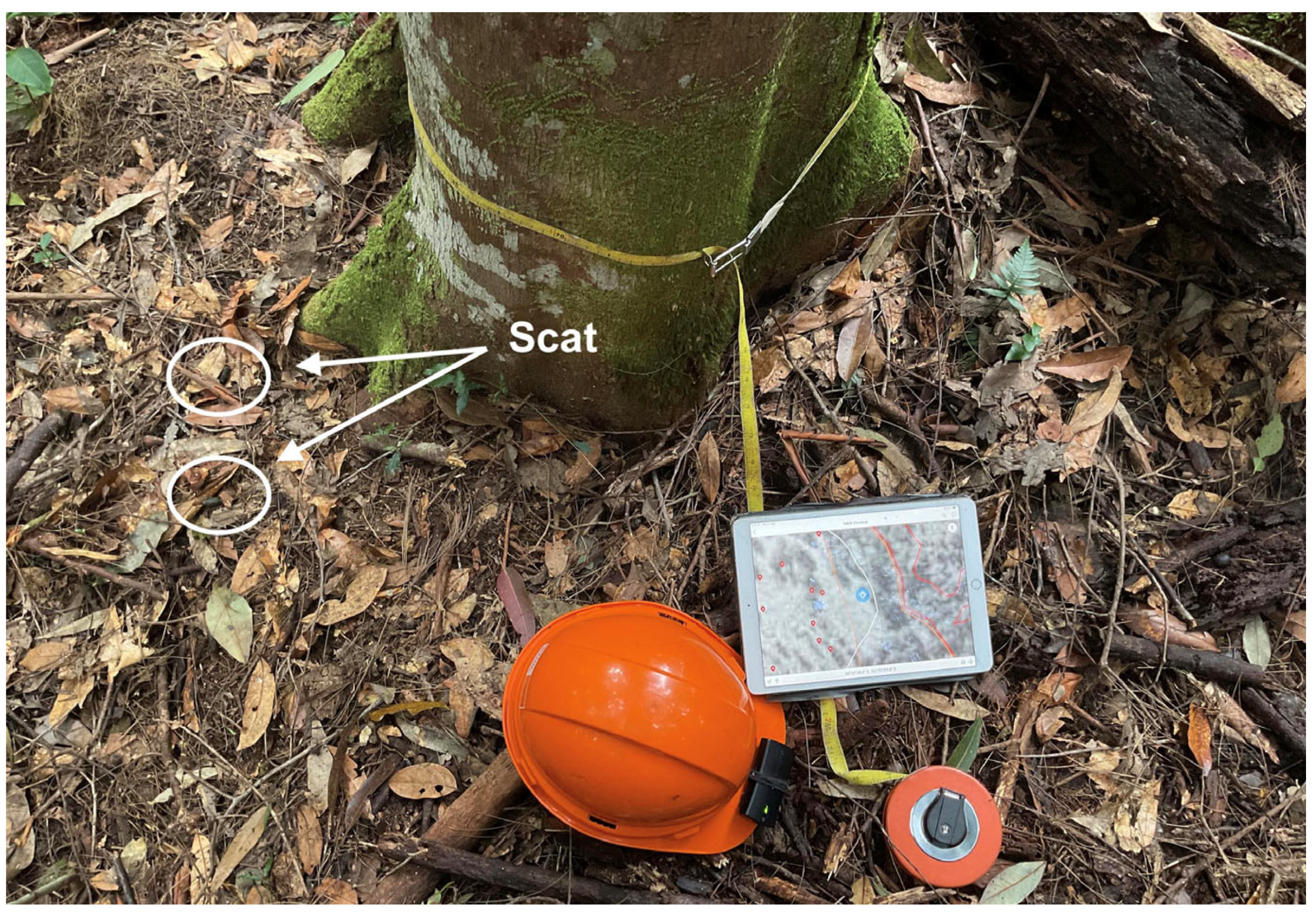 Figure 9. Record of tree (Cryptocaria glaucescens 2030 mm CSHOB) with koala scats in situ.