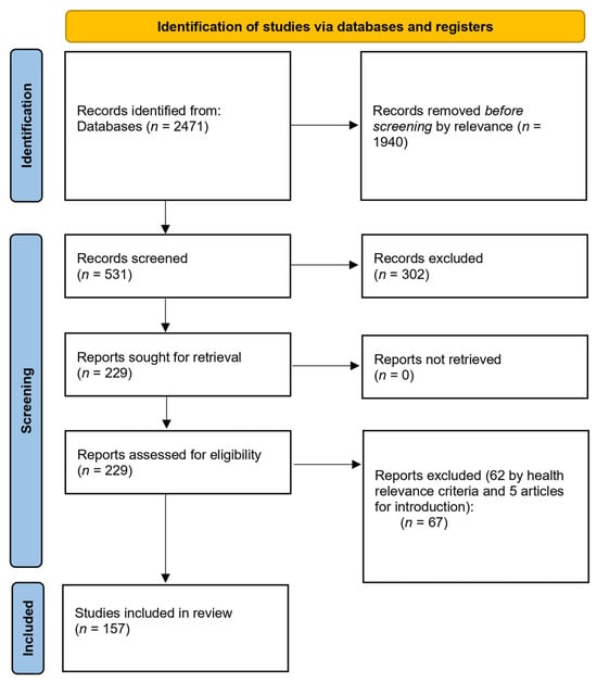 A total of 2471 records were retrieved from Google Scholar, SciELO, and PubMed (Figure 3). After preliminary filtering to remove irrelevant records (n = 1940), 531 were screened in detail. Of these, 229 were retained for eligibility assessment, and 162 met the inclusion criteria. Excluded articles were mainly unrelated to the health or ecological context of L. gymnocercus.