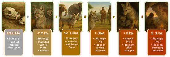 In that way, paleo-ecological and archaeological evidence places the Pampas fox as both a persistent faunal element and an active participant in long-term human–animal relationships. Remains in cultural contexts indicate that Indigenous groups recognised it as a resource, symbol, or companion, embedding it within ecological continuity and evolving practices [10,11,12,13]. From the Late Pleistocene to the Holocene, it endured climatic shifts, extinctions, and cultural transformations—emerging as a resilient cohabitant of human landscapes and a quiet witness to South America’s ecological history (Figure 5).