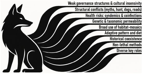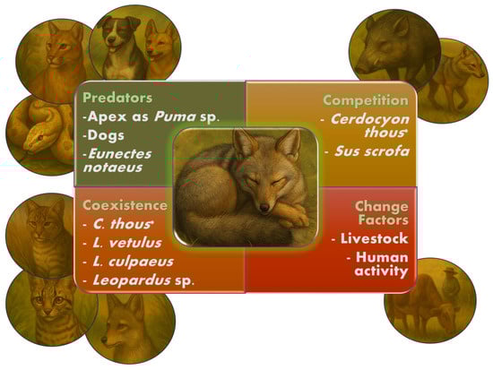 Ecological relations further underline its resilience. In the Espinal ecoregion and coastal dunes, L. gymnocercus overlaps temporally with Leopardus geoffroyi and Conepatus chinga, but spatial partitioning reduces conflict [76,77,78]. Mosaics of forest, water, and fields sustain carnivore diversity [79,80]. Scavenging experiments show delayed but significant participation [81]. Predation pressures include Puma concolor, free-ranging dogs, and species like Eunectes notaeus [82,83,84], with relations to C. thous and L. culpaeus ranging from competition to coexistence [85,86]. Foraging dynamics are further shaped by invasive Sus scrofa and human-driven changes such as livestock and land conversion [87,88]. Considered as a whole, these pathways (Figure 10) reveal the Pampas fox not only as resilient but as a mediator within evolving ecological networks.