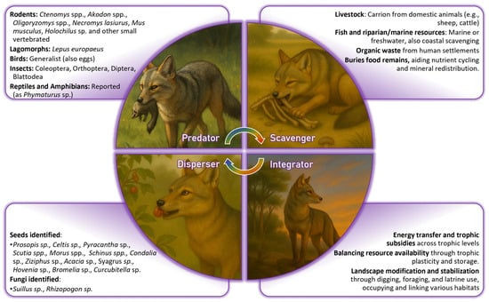 Its influence extends beyond consumption: by dispersing seeds and fungal propagules, the fox aids in vegetation regeneration, yet can also promote invasive species—acting as both a restorative and transformative agent. These dualities highlight the importance of context and the need for regionally nuanced management. Overall, the Pampas fox serves as a pivotal ecological node, functioning as both predator and scavenger, while also acting as a disperser and mediator, thereby contributing to energy transfer, nutrient cycling, seed germination, and ecological connectivity across natural and human-modified environments. Behaviours such as bone burial and seed dispersal stabilise fragmented habitats and reshape food webs. Figure 12 summarises these roles, presenting the Pampas fox as a dynamic agent of ecological balance.