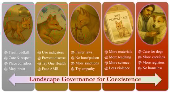 Recent contributions have expanded knowledge of its distribution, including new records in eastern Paraguay and observations on mortality, local perceptions, diseases, and potential play behaviour [5]. At the same time, the Pampas fox has been used to illustrate the value of structured research approaches in advancing knowledge of wild carnivores [6]. Together, these findings underscore the importance of ongoing ecological, behavioural, and conservation-focused studies on this resilient yet threatened species. Although ecologically adaptable, the Pampas fox (Figure 2) is often perceived negatively due to its sporadic predation on livestock and its potential role in disease transmission, which can lead to rural conflict and increased hunting pressure. Previous research has mainly addressed isolated topics, lacking interdisciplinary integration. This review synthesises over 150 documents from five South American countries, consolidating information on ecological, health, and human–wildlife conflict. It establishes the first regional baseline from a One Welfare, One Health, and Planetary Health perspective. The Pampas fox exemplifies the complex interplay between biodiversity conservation, rural livelihoods, and disease ecology in South American agroecosystems. Recognising the species as a sentinel, rather than a pest, is essential for guiding future policy development.