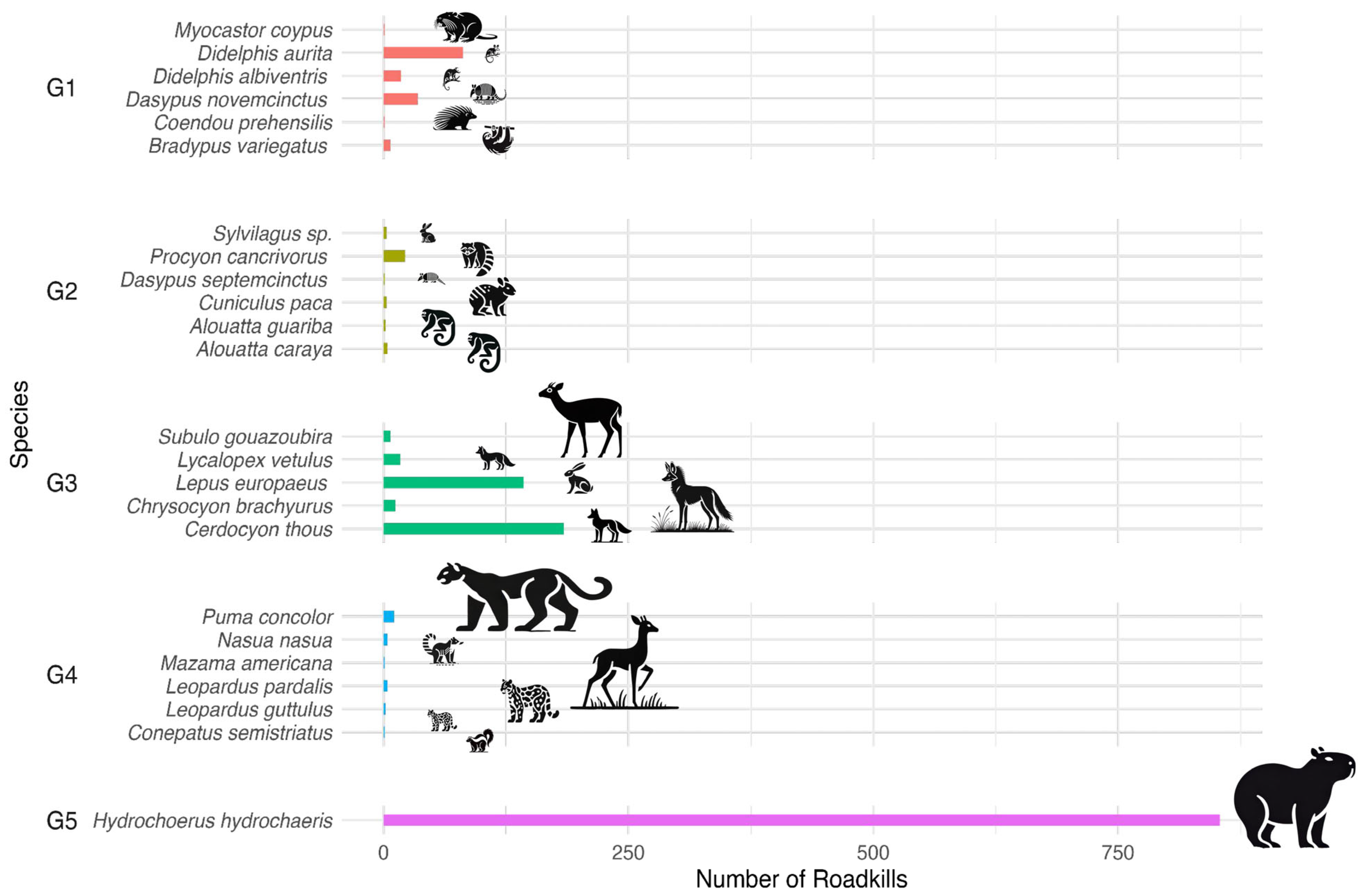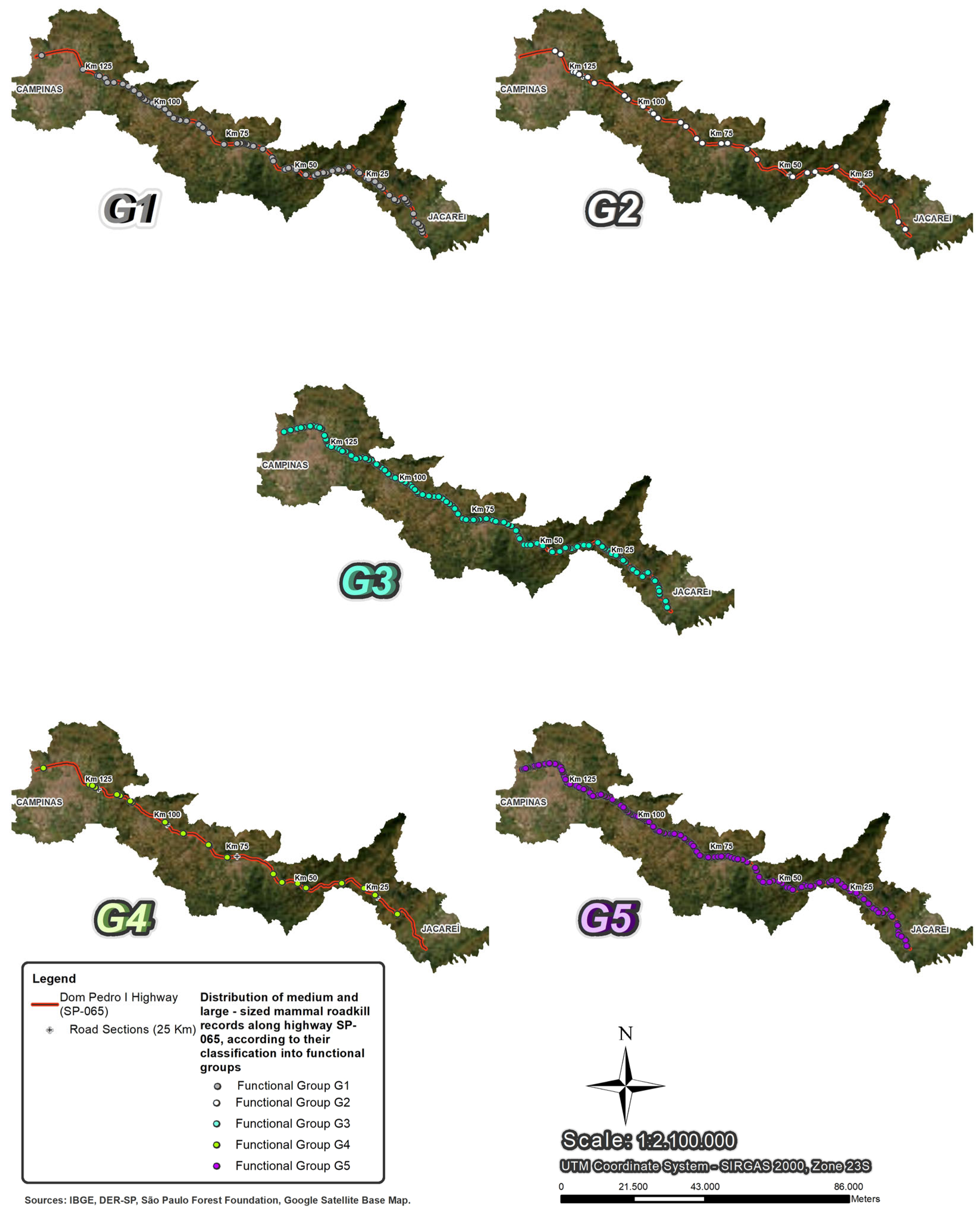 - Secco, H.; Farina, L.F.; da Costa, V.O.; Beiroz, W.; Guerreiro, M.; Gonçalves, P.R. Identifying Roadkill Hotspots for Mammals in the Brazilian Atlantic Forest using a Functional Group Approach. Environ. Manag. 2024, 73, 365–377. [Google Scholar] [CrossRef]