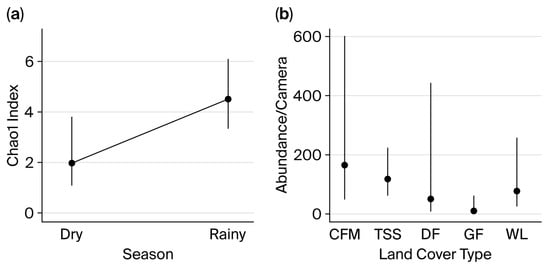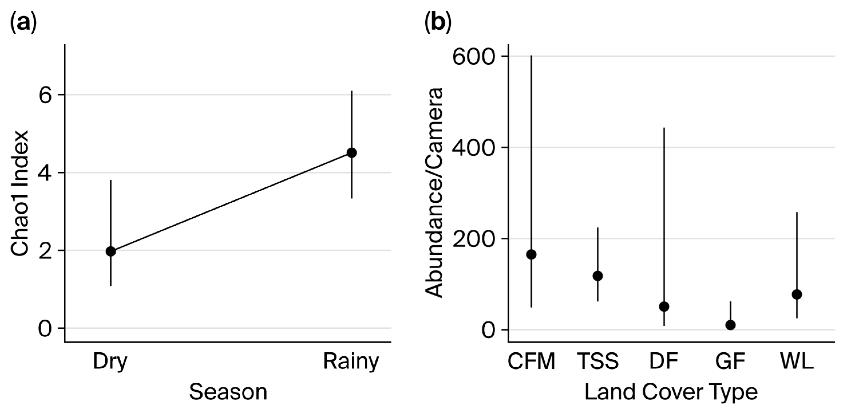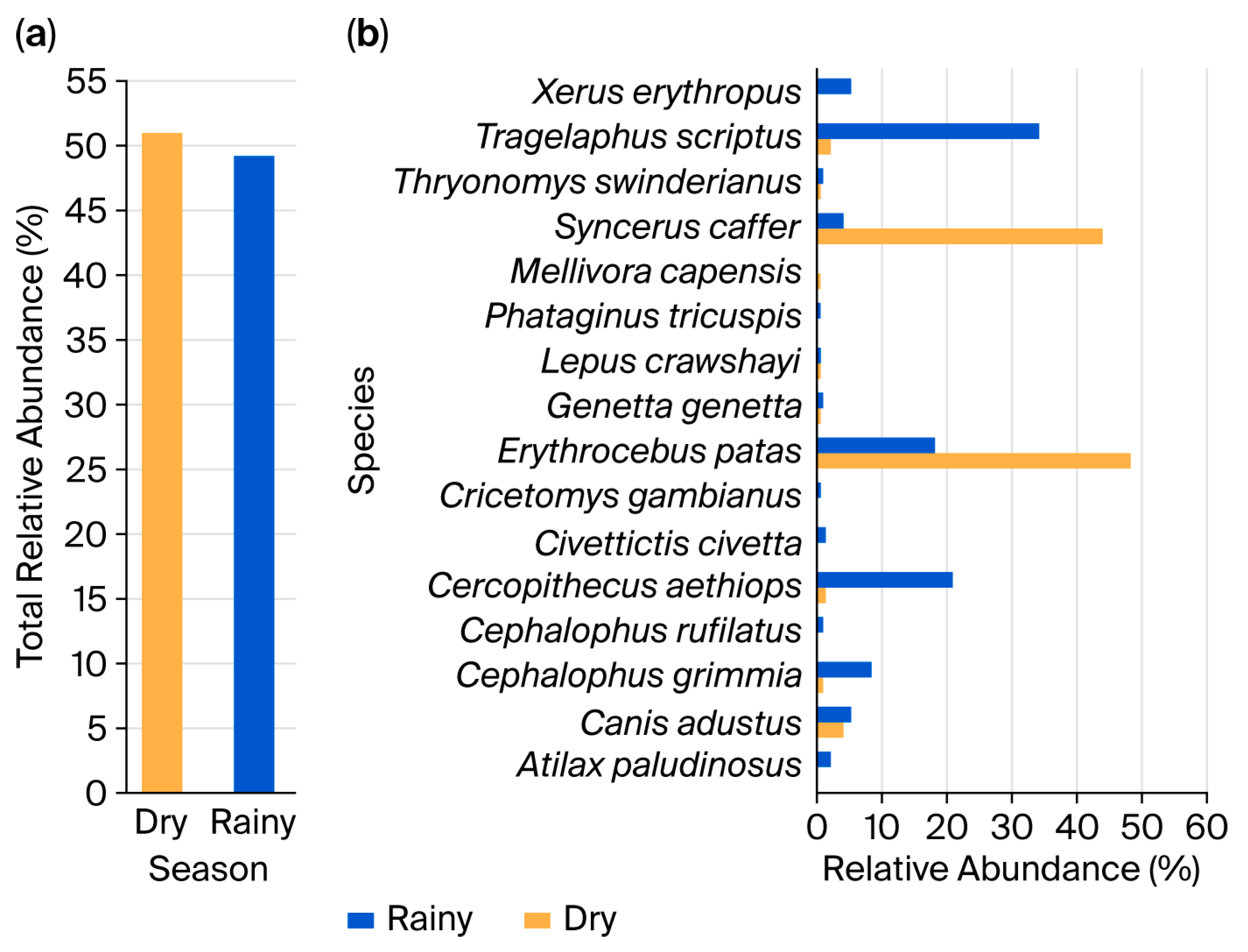 2.3.3. Seasonal Variations in Diversity and Abundance of Mammal Species in the Forest