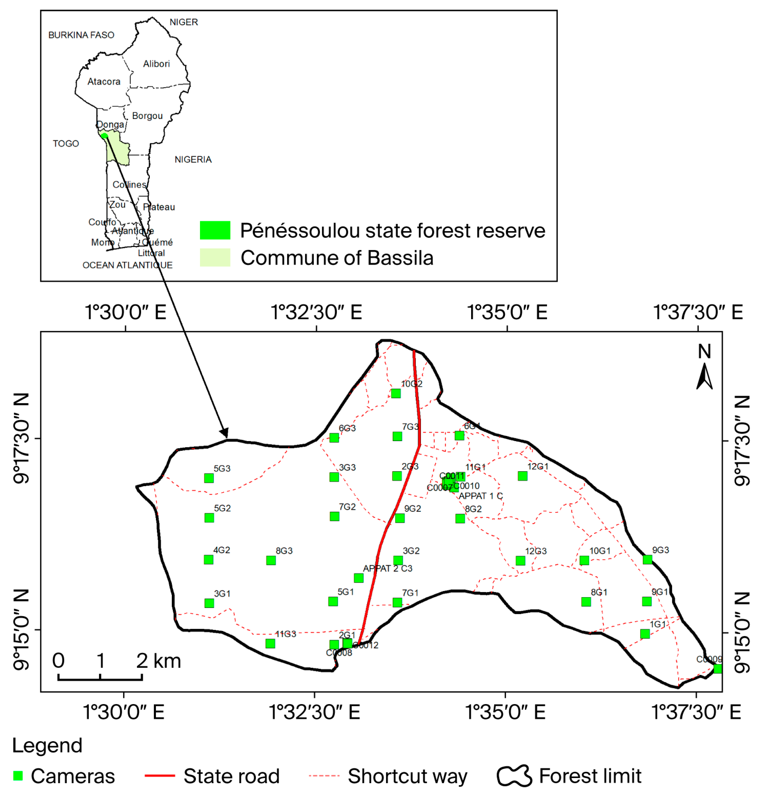 - Nago, S.G.A.; Tchegnonsi, J.L.M.; Ahononga, C.F.; Sagbo, R.R.S.; Kake, G.; Ganso, R. Recolonisation de la forêt classée de Pénéssoulou par la faune mammalienne. Rev. Ivoir. Sci. Technol. 2024, 43, 260–280. [Google Scholar]