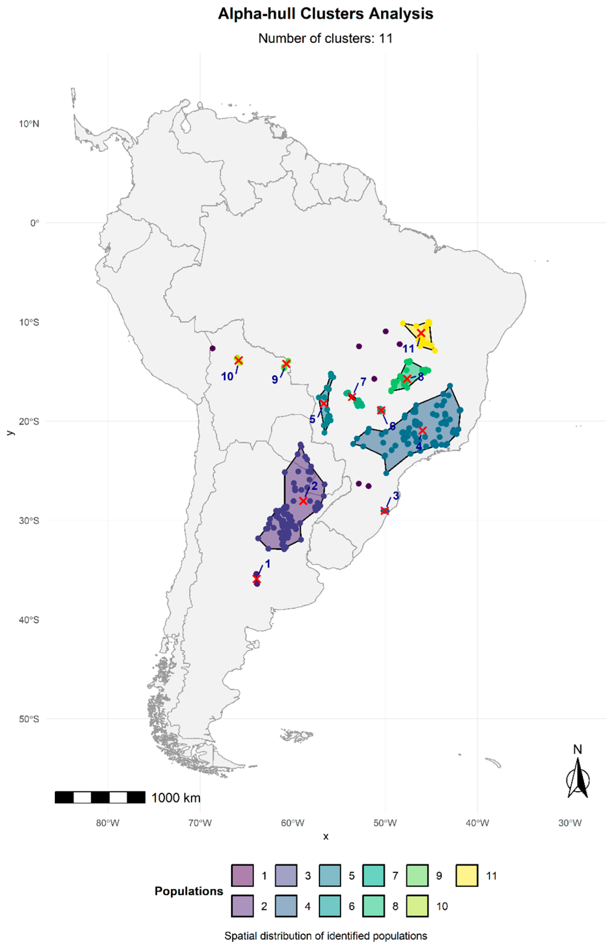 Minimum distances between cluster centroids ranged from 332.733 km (α-population 5) to 3332.733 km (α-population 7), with most populations separated by distances exceeding 300 km. In total, the identified populations are distributed across five countries: Brazil, Argentina, Paraguay, and Bolivia. The occupied biomes primarily include the Cerrado, with additional occurrence in the Chaco, Atlantic Forest, Pantanal, and transition zones with the Amazon.