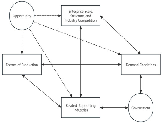 Michael Porter proposed the theory of competitive advantage in 1990 (Figure 1). This theory states that industry advantage depends on six factors: production factors, market demand, related industry development, corporate management, government policy, and opportunities [21]. In evaluating resource elements, the competitive advantage theory emphasizes management factors and visible competitiveness in the development of rural destinations. It also highlights the potential competitiveness of dynamic development capabilities. Furthermore, in the study of rural tourism industry competitiveness, this theory suggests adopting a differentiation development strategy. The literature review indicates that some researchers directly applied this model when analyzing the competitiveness of tourism destinations.