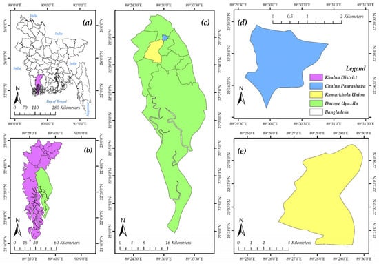 Map of study areas: (a) Bangladesh, (b) Khulna District of Bangladesh, (c) Dacope Upazila/Sub-district of Khulna District, (d) Chalna Paurashava/Municipality of Dacope Upazila, and (e) Kamarkhola Union of Dacope Upazila.