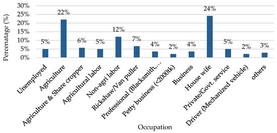 The predominant factor contributing to households’ vulnerability was the primary source of income. Most of the population in the study area was employed in agriculture, while a small percentage engaged in small-scale business activities and utilized bicycles for transportation. The study emphasizes the prevalence of poverty in the selected region, with 22% of households reliant on agriculture for their livelihoods (Figure 3). A particularly salient phenomenon is that of childhood marriage, which leads to a significant proportion of women becoming housewives and being unable to support their families. This issue is further exacerbated by the significant unemployment rate among males, primarily due to a dearth of opportunities in the agricultural sector.