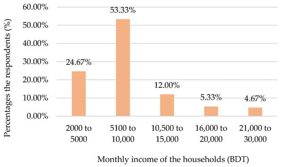 In the area under study, most individuals live below the poverty line. While some residents in this neighborhood generate income daily, others do so on a monthly basis. The monthly income of these individuals is displayed in Figure 4. The predominant proportion of respondents (53%) reported monthly incomes ranging from 5100 to 10,000 BDT (Bangladeshi Taka), which is equivalent to approximately 50–100 USD only.