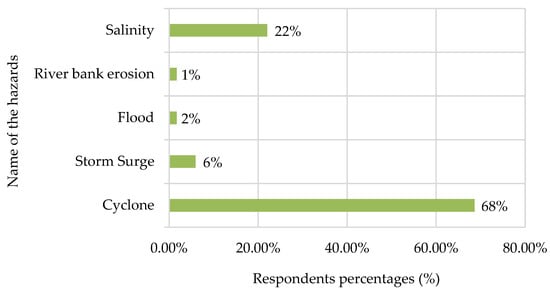 Approximately 22% of families in the study areas reported experiencing salinity intrusion, while 68% of households reported experiencing cyclones. A negligible proportion of respondents reported being impacted by storm surges (6%), riverbank erosion (1%), or flooding, primarily in rivers (2%) (Figure 5). On average, three cyclones have impacted these locations annually over the past five years. While most respondents reside in proximity to bodies of water, such as rivers and the sea, it is noteworthy that the incidence of injuries or fatalities resulting from natural disasters has been minimal in all survey locations. A substantial proportion of respondents, amounting to approximately 96%, perceived a recent escalation in the frequency and severity of natural hazards. Furthermore, these respondents indicated an augmented sense of vulnerability to these hazards, a perception that is growing.