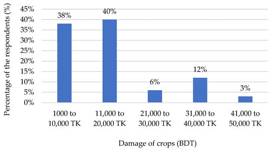 Agriculture, the primary source of income for the local population, is one of the most vulnerable industries in the study area. A minor alteration in agricultural practices, caused by calamity, has the potential to significantly impact the community’s livelihood. The respondents’ crops were subject to the following types of damage (Figure 6): 38 percent of the respondents experienced losses ranging from 1000 to 10,000 BDT (approximately 10–100 USD), 40 percent experienced losses ranging from 11,000 to 20,000 BDT (110–200 USD), 6 percent experienced losses ranging from 21,000 to 30,000 BDT (200–300 USD), 12 percent experienced losses ranging from 31,000 to 40,000 BDT (300–400 USD), and 3 percent experienced losses ranging from 41,000 to 50,000 BDT (400–500 USD).