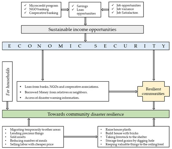 Research by Hallegatte et al. (2016) lends further support to this perspective, underscoring the inherent connection between climate resilience and economic inclusion [60]. In addition, literature from the United Nations Development Programme (UNDP) in Bangladesh highlights the necessity of community-driven, localized, and economically inclusive resilience-building initiatives in coastal regions [62]. Prior studies have critically examined the limitations of traditional, top-down resilience strategies, which often fail to address the complex, place-specific socio-economic dynamics that shape community vulnerability [62,63,64,65,66]. Meanwhile, this study advances the discourse by proposing a conceptual framework that explicitly links economic security with disaster resilience, emphasizing the influence of local economic systems, informal livelihoods, and community coping mechanisms on resilience outcomes (Figure 9). The proposed framework is grounded in community-based data and practices collected from vulnerable coastal regions of Bangladesh, allowing it to reflect the lived experiences and specific challenges faced by at-risk populations. As such, it offers a nuanced and contextualized perspective that captures the diversity of local realities, and recognizes the interplay between social and economic factors in shaping resilience. This grounded approach aligns with contemporary policy recommendations that emphasize participatory climate governance and localized economic planning, ensuring that resilience strategies are both inclusive and contextually relevant.
