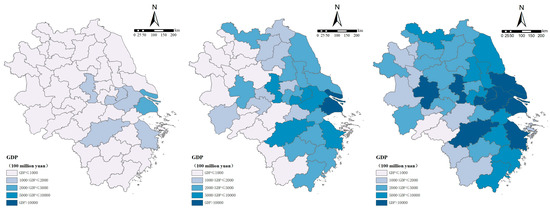 From 2000 to 2020, the spatio-temporal pattern of the total GDP in the YRD urban agglomeration showed significant circle-layered evolution characteristics, forming a typical spatial structure of “taking Shanghai, southern Jiangsu, and northern Zhejiang as the core, with values decreasing layer by layer outward.” Specifically, in the economic landscape of the YRD urban agglomeration in 2000, cities with a GDP exceeding CNY 100 billion were still scarce. Only six cities—Shanghai, Nanjing, Hangzhou, Suzhou, Wuxi, and Ningbo—surpassed the CNY 100 billion threshold. Among them, Shanghai led far ahead with an economic aggregate of CNY 450 billion, having become the only “400-billion-yuan-level” city in the region. By 2010, the regional economy achieved leapfrog growth, with as many as 26 cities entering the CNY 100 billion GDP club. The six early leading cities all exceeded the CNY 500 billion threshold, and Shanghai further consolidated its leading position with an economic volume of over CNY 1.7 trillion. By 2020, the economic strength of the YRD urban agglomeration reached a new height: except for Huangshan and Chizhou in Anhui province, all other cities had joined the CNY 100 billion GDP club, and a number of CNY one trillion GDP powerhouse cities had emerged. On top of the original six cities, Hefei and Nantong also successfully joined this echelon (Figure 1).