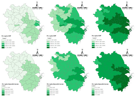While the total GDP can intuitively reflect the scale of development, it is difficult to accurately characterize people’s well-being and quality of life. Therefore, this section uses the per capita GDP and per capita disposable income of urban and rural residents as indicators to deeply analyze the evolution characteristics of the development quality in the Yangtze River Delta urban agglomeration from 2000 to 2020 from the perspectives of the individual economic level and income distribution (Figure 2).