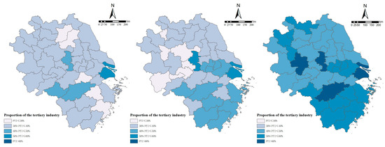By 2010, the overall proportion of tertiary industry in the region slightly increased to 37%, and the spatial pattern showed a differentiated feature of “south rising and north stable”. Most cities with active private economies in southern Zhejiang relied on the development of commercial and trade services, and the proportion of tertiary industry exceeded 40%. As the provincial capital, Nanjing, relying on the concentration of scientific and educational resources and economic development, became the second city with a proportion of tertiary industry exceeding 50%. The growth rate at this stage was relatively slow, mainly constrained by the fact that the Yangtze River Delta as a whole was in the peak period of industrialization. Strong manufacturing cities such as Suzhou and Wuxi still took secondary industry as their mainstay, delaying the process of regional industrial structure upgrading.