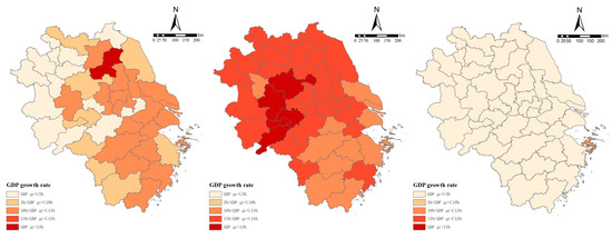 By 2020, the growth rate pattern had undergone a fundamental transformation, with the regional average significantly slowing to 3.8% and the entire region falling within the low-to-medium growth range of 1–5%, except for Zhoushan City, which reached 12%. This phenomenon stems from the national policy oriented toward high-quality economic development, as China’s economy has entered a new normal of “growth rate shifting and structural adjustment.”