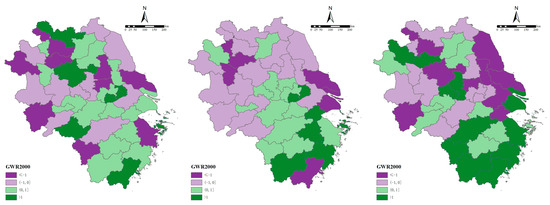 Table 12 and Figure 10 present the results of the geographically weighted regression of the impact of population aging on economic growth in the Yangtze River Delta from 2000 to 2020. It can be observed that the adjusted R2 values in 2000, 2010, and 2020 are 0.3656, 0.8797, and 0.9345, respectively, and that the AIC statistic remains at a relatively low level, which indicate that the model’s fit to spatial heterogeneity improves over time, with its explanatory power gradually increasing, and makes it suitable for GWR analysis. This study divides the regression coefficients into four intervals: coefficients less than or equal to −1 are defined as significantly inhibitive; [−1, 0] as mildly inhibitive; [0, 1] as mildly promotive; and greater than 1 as significantly promotive. As a result, these coefficients reveal the spatial differentiation of impact intensity.