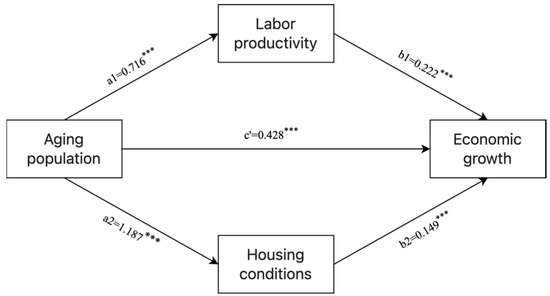 Fourth, population aging in the Yangtze River Delta affects economic growth through two mediating variables: labor productivity and living conditions. Both play a significant “partial mediation” role, accounting for 34.12% and 47.45% of the total economic growth, respectively. Together, they exert a positive parallel mediation effect, with a parallel mediation effect value of 0.3359.