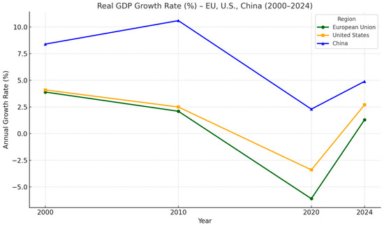 The data presented throughout this report suggest that the EU is not keeping pace with the United States and China in several key areas of digital competitiveness. The Global Innovation Index (GII) shows that the EU has made only modest gains, while China has rapidly climbed the rankings and the U.S. maintains a dominant position [16]. GDP growth in the EU has stagnated, limiting public and private sector capacity to invest in strategic digital infrastructure [26,27]. Meanwhile, China’s economic rise and the U.S.’s post-crisis resilience have sustained their innovation ecosystems.