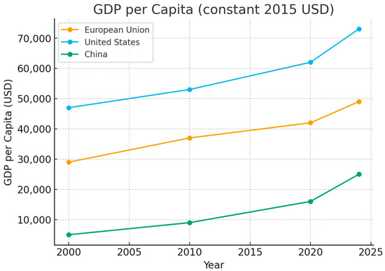 GDP per capita is a widely used proxy for national wealth, labor productivity, and the capacity to absorb and scale innovation. Higher values generally indicate stronger infrastructure, better education systems, and more advanced digital readiness [27,28]. In this analysis (Figure 2), GDP per capita figures are expressed in constant 2015 U.S. dollars, which means they are adjusted for inflation using 2015 as the base year. This ensures comparability across time periods by isolating real growth from nominal price changes [28].