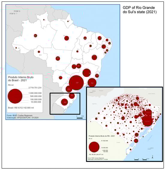 Input–output (IO) analysis has been recognised as a tool for examining the interdependencies within an economy, allowing the determination of how sectors are interconnected through trade flows of goods and services [,]. While country-level IO tables allow one to analyse the structure of a specific economy, it might be insufficient to capture the economic linkages that unfold across subnational territories, especially in countries marked by regional disparities [,,]. This is the case of the state of Rio Grande do Sul (RS), in southern Brazil, which exhibits a highly diversified economic structure combined with pronounced territorial disparities. As of 2021, Rio Grande do Sul’s state accounted for 6.5% of Brazil’s gross domestic product (GDP), ranking as the fourth-largest state economy in the country []. Its productive structure encompasses strong agro-industrial chains (such as soybeans, beef, poultry, and dairy), a strong manufacturing sector (including food processing, chemicals, and machinery), and a diversified service sector concentrated in metropolitan areas such as the capital city, Porto Alegre, and Caxias do Sul, and Pelotas. However, this sectoral heterogeneity is unevenly distributed across municipalities. For instance, the Metropolitan Region of Porto Alegre—comprising 34 municipalities and accounting for 38% of the state’s population and 47% of its total GDP—concentrates services and industrial clusters, as shown in Figure 1. Otherwise, much of the interior municipalities remains specialised in agriculture and agro-industry, often with lower value-added and reduced industrial complexity []. Furthermore, rural municipalities exhibit greater sensitivity to climatic variability and market shocks, revealing structural regional disparities.