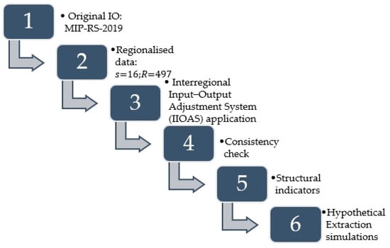 This section presents the methodological procedures applied to estimate an intermunicipal input–output system for the state of Rio Grande do Sul, Brazil, based on the Interregional Input–Output Adjustment System (IIOAS) developed by [,]. The objective is to redistribute sectoral flows from the state-level IO matrix across 497 municipalities, ensuring regional coherence between supply, demand, and interregional trade flows.