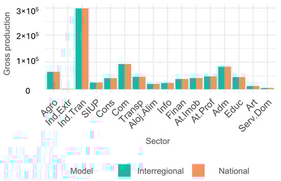 Figure 3 shows a sectoral comparison of total gross production between the original state-level matrix and the sum of the disaggregated intermunicipal estimates from IIOAS. Thus, the regionalisation process preserved the aggregate output. Discrepancies are negligible and fall within the tolerance range imposed during the RAS iterative adjustment.