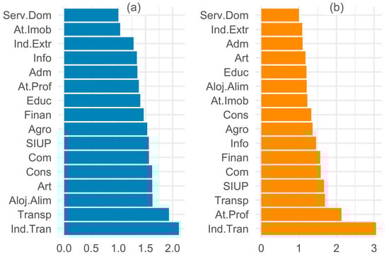 Backwards Lingakes (a) and Forward Linkages (b). Note: Blue colour represents backward linkages (BLs). Orange colour accounts for forward linkages (FLs). Backward Linkages (BLs) illustrate the intensity of backward linkages across municipalities. Higher values indicate stronger dependence on intermediate inputs supplied by other regions, revealing upstream vulnerabilities in the production network. Forward Linkages (FLs) shows the strength of forward linkages, measuring how much a region contributes to the supply of inputs used elsewhere. It highlights strategic hubs in value chains with strong downstream influence.