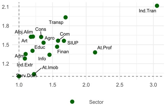 Figure 4 and Figure 5 present the indices of backward linkages (BLs) and forward linkages (FLs) for the regionalised system. These structural indicators reflect, respectively, the dependence of each sector on inputs from the rest of the economy (BL), and the degree to which the sector provides inputs to other sectors (FL). The results show that manufacturing of transport equipment (Ind.Tran) and transport services (Transp) are among the most interconnected sectors, with strong multipliers in both dimensions. These sectors operate as core nodes within the regional production network, stimulating upstream and downstream activities across and within sectors and municipalities of Rio Grande do Sul’s state. In contrast, sectors such as domestic services (Serv.Dom) and real estate activities (At.Imob) exhibit weaker linkages, acting more as terminal sectors with limited spillover capacity.