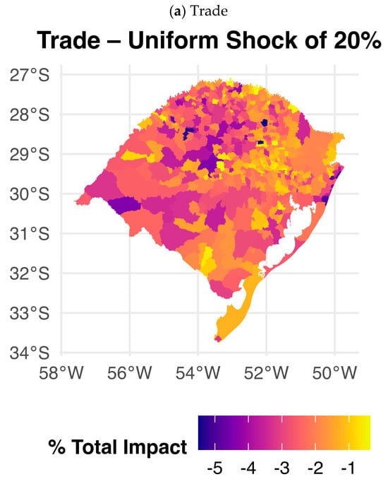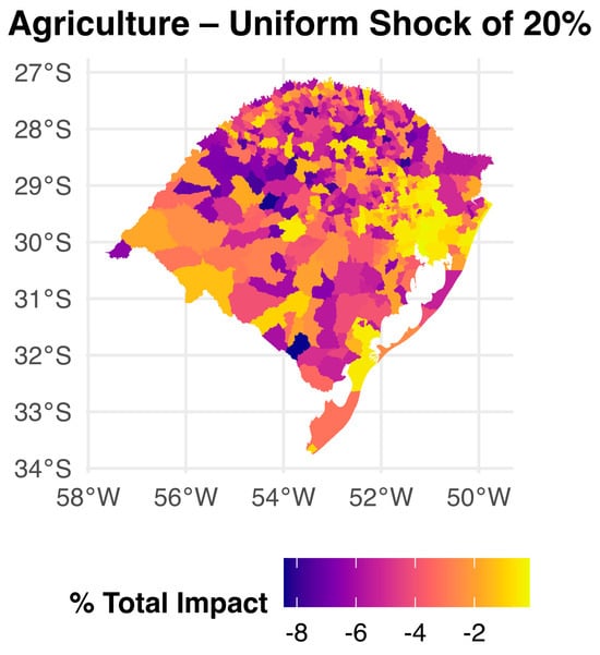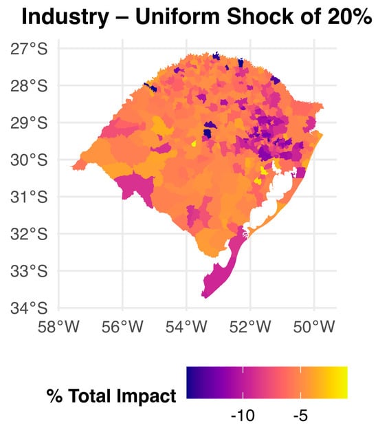 Figure 6 illustrates the spatial distribution of total production impacts across the IRIO’s regions. The colour gradient represents the percentage reduction in total production per municipality, revealing heterogeneity in the spatial propagation of the shock. The most severely affected areas are in the central-western and northern interior of the state. These regions are characterised by high agricultural dependency and limited economic structure diversification, making them relatively most vulnerable to disturbances in primary production. Municipalities such as Pedras Altas, Jari, André da Rocha, Santa Cecília do Sul, and Jacuizinho registered total production declines exceeding 8%, significantly above the state average. These localities have high shares of agricultural GDP, and their local economies are strongly dependent on agribusiness supply chains.