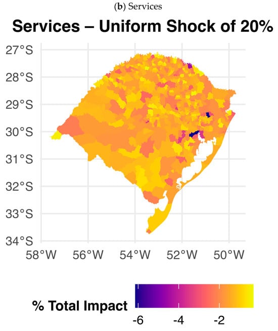 The propagation of losses beyond the agricultural base is visible in the case of Rolador, Boa Vista do Cadeado, and Capão do Cipó, where secondary linkages with sectors such as transport, trade, and manufacturing intensified the downturn. This spatial pattern reinforces the structural asymmetries within the Rio Grande do Sul’s Brazilian state. While some urban and service-oriented municipalities (especially in the metropolitan area) experienced marginal or negligible effects, vast rural regions showed acute sensitivity to sectoral shocks.
