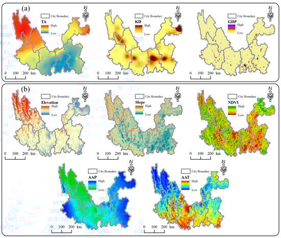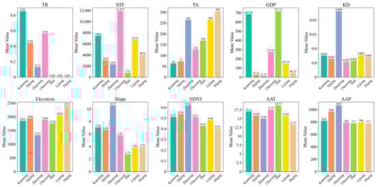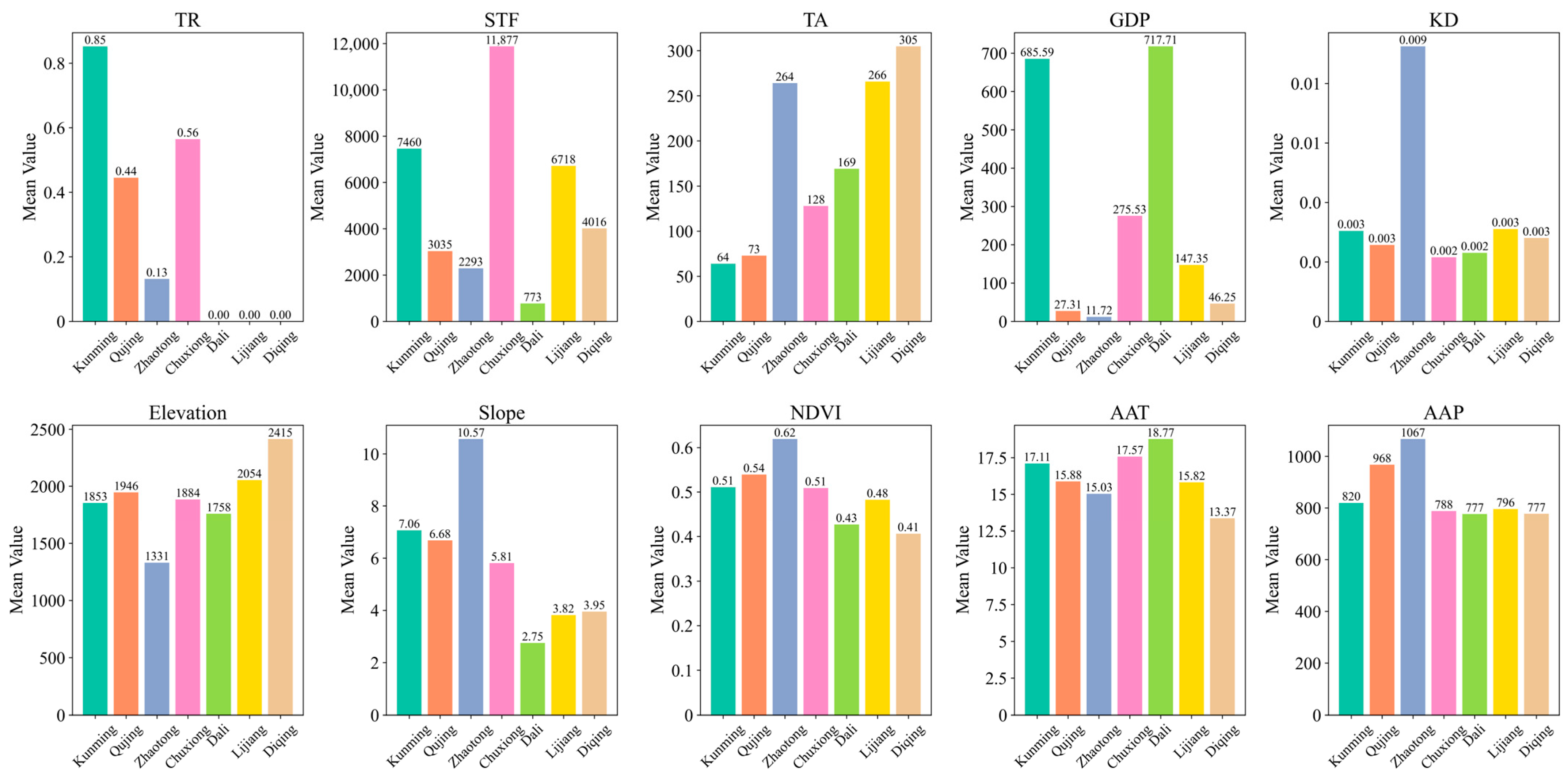 - Annual average precipitation (AAP), transportation accessibility (TA), and annual average temperature (AAT) are the core indicators influencing the development of red cultural tourism resources. Among them, transportation conditions and resource clustering play a dominant role in social influence, while climatic and topographic factors hold key significance for ecological carrying capacity.