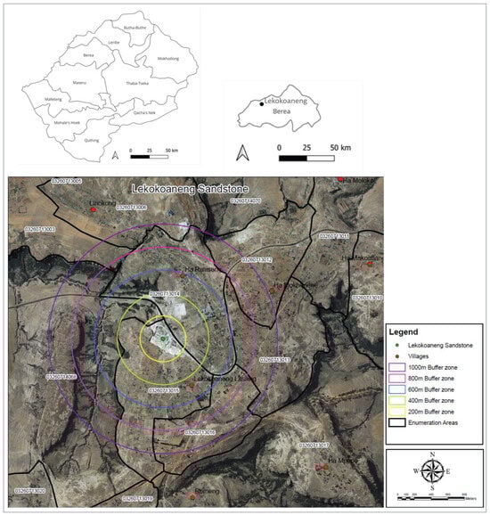 Literature on the impacts of large-scale mining in Sub-Saharan Africa [,,]. Studies focusing on the socio-economic and spatial effects of quarrying remain limited, especially in landlocked countries like Lesotho. While existing literature often presents general perspectives on the impacts of extraction, this overlooks the spatial inequalities that arise from quarrying. Households closest to quarries may gain employment but also face disproportionate environmental burdens, such as dust exposure and land degradation. So, by applying a mixed-methods approach across five buffer zones ranging from zero to one thousand m from the formal quarry site, this paper explores how quarrying influences household incomes, employment opportunities, livelihoods, health, and access to essential resources.