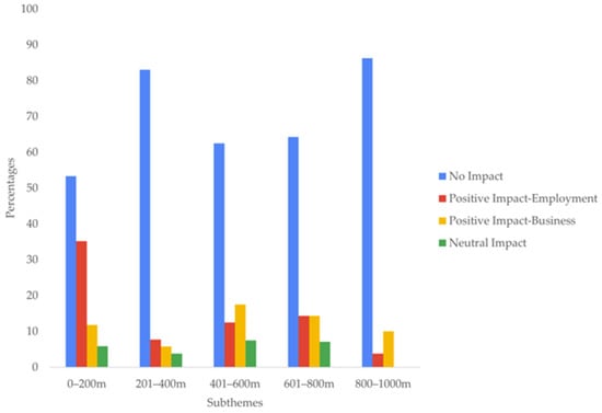 The positive impact range per buffer zone reported in the study reflects variations in survey responses across zones, informal vs. formal employment, temporal differences, and gender or age-based household roles.