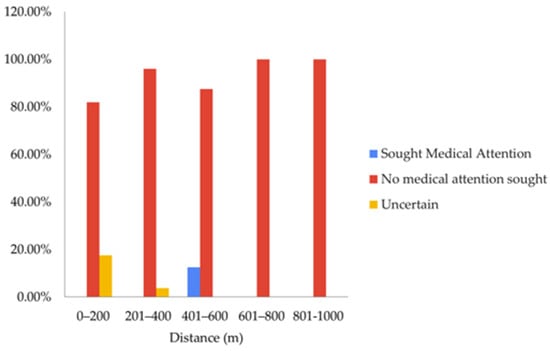 Health effects were categorized into sought medical attention, no medical attention, and uncertain responses (Figure 5). 12.5 percent of respondents in the 401–600m buffer zone reported seeking medical attention for respiratory issues linked to dust exposure. Respondents in the 0–400 m zones reported uncertainty, suggesting underreporting or a lack of formal health assessments. The 601–800 m and 801–1000 m zones recorded 100 percent of respondents stating that no medical attention was sought, indicating lower perceived health risks in distant areas.