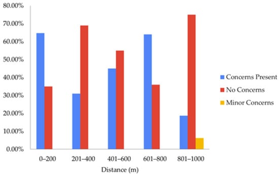 Community concerns about health and safety risks were categorized into concerns present, no concerns, and minor concerns (Figure 6). 64.7 percent of respondents in the 0–200 m buffer zone expressed serious concerns, particularly about dust-related illnesses and water contamination risks. Similarly, 64 percent of respondents in the 601–800 m buffer zone reported safety concerns. The 201–400 m and 801–1000 m zones recorded fewer concerns, with 69 percent and 75 percent of respondents stating no significant issues. Only 6.25 percent of respondents in the farthest zone reported minor concerns, primarily about speculative health risks.