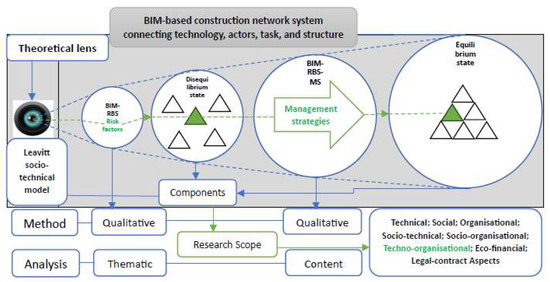BIM implementation is a combination of information technology (IT) in a social environment that requires an organization culture change. Therefore, its success in organizations depends not only on technical issues but also on social issues [38]. Hence, to examine this integration from a techno-organizational perspective requires a theoretical framework and means of evaluation for a successful BIM implementation by AEC professionals. Theories act as a bridge between variables, while a theoretical lens guides a study [39,40]. There are various theoretical models and frameworks for the design and analysis of BIM studies from a techno-organizational perspective. For example, Technology Organization Environment Theory, Delone and McLean IS Success Model [41] and Leavitt Socio-technical Model (LSTM) etc. [42]. The Leavitt’s model comprises of four components tightly connected to each other (i.e., technology, actors, task, and structure). Mat Ya’acob et al. [43] applied the model to investigate collaboration in BIM-based construction networks (BbCNs) (i.e., BbCNs is a BIM system that connects technology, actors, task, and structure in BIM-enabled projects). They extended the model by including new components that act in synergy to achieve a balance in socio-technical systems. Therefore, the proposed theoretical framework for this particular paper was developed by [44] perceived as the “blueprint” of this research enquiry serving as a guide. It is the structure that summarizes concepts and theories, and supports them within a research study [45,46]. The blueprint is suitable for this study because it encompasses the extended version of the sociotechnical theory known as the Leavitt Socio-technical Model (LSTM) developed by [42]. In [47], the study utilizes the model to examine the BIM implementation process within an organization in relation to the sociotechnical framework. Their findings suggest that a complex and interrelated set of incidents, events, and gaps emerged, threatening the stability of organizational norms and work processes. This indicates extending the model to include additional components in developing a framework to examine all the aspects is beneficial. Hence, the Leavitt sociotechnical model is a suitable theoretical lens for this study, as its underlying principles closely reflect the working nature of BIM systems and are capable of explaining the challenges of modern sociotechnical systems (STSs). Its explanatory power expands to include new components, producing a modified model that better reflects BIM-related systems [44,47,48]. Therefore, an extended version of the Leavitt sociotechnical model, incorporating components of BIM-RBS risk factors and BIM-RBS-MS management strategies (i.e., socio-organizational, technical, legal-contract, eco-financial aspects etc. see Figure 1) developed by [44], will provide the theoretical basis for examining all categories while limiting the scope to the techno-organizational dimension. This is because the fundamental principle enacted with the model states that all the components are highly interrelated, and the system is in a state of equilibrium. Any event that causes a change in the system is an incident (i.e., risk factor). These incidents shift the system into a state of disequilibrium and is determined by the boundaries of the deep structure representing the risk magnitude. Therefore, an intervention is required (i.e., management strategy) to move the system back to a new equilibrium state [43,44,48]. Figure 1 displays the developed theoretical framework by [44] and its application to this study shown in green color.