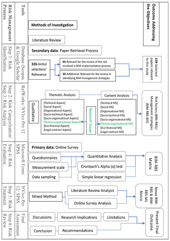 This approach involved manually sifting through and analyzing both qualitative data (i.e., literature review) and quantitative data (i.e., online survey), enabling different perspectives and paradigms to frame the Nexus BIM-RBS and BIM-RBS-MS matrix and develop the database. This approach helps gain a holistic understanding of risk factors, their magnitude, and management strategies for implementing BIM by comparing data and producing more robust and compelling results with global relevance.