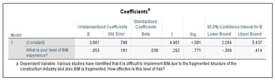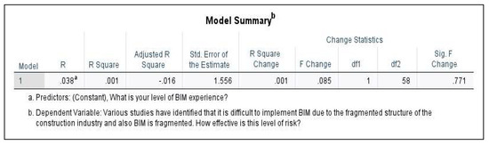 - Simple linear regression (SLR): attempts to predict the outcome variable (BIM-RBS) using the predictor variable (Level of BIM experience). The test procedure involved [Click Analyze > Regression > Linear > select outcome variable and move to the ‘Dependent’ box > select predictor variable and move to the ‘Block 1 of 1’ box > Select Statistics > click Estimates, Confidence Intervals, Model Fit, R Squared Change, and Descriptives]. See results in Section 3.2.