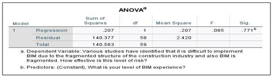 A simple linear regression was used to predict the magnitude of the risk factors in BIM-RBS Techno-organizational Aspect (TOA) based on the level of BIM experience. The results showed that experience is a significantly influence on the TOA, however it only accounted for less than 1% of the variance seen in TOA. F = 0.085, p ≤ 0.001, R square = 0.001, R square adjusted = −0.016. The regression coefficient (B = −0.053, 95% CI (−0.309, 0.414) indicated that an increase in one point level of BIM experience score, would correspond, on average, to a decrease in BIM-RBS (TOA) score by −0.053 points.