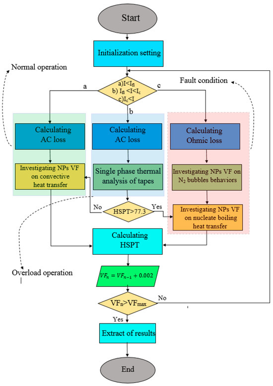 In the thermal analysis, the influence of nanoparticles on the heat transfer performance of the HTS transformer was examined under both steady-state and transient conditions. In both of these modes, the first step is calculating the heat generated in the windings and other parts of the HTS transformer, and the second step is focused on analyzing the heat transfer rate. The flowchart shown in Figure 2 describes the process of this paper.