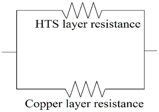 In the fault condition, the ohmic loss is the dominant part of the loss, and AC loss can be ignored. Ohmic loss is mainly created in the superconducting layer and stabilizer layer. Due to the lower resistance of the copper layer compared to the superconducting layer, in fault current conditions, the majority of the heat in the HTS tape is generated in the stabilizers. Moreover, stabilizers are located on the top and bottom of the tape so that convective heat transfer occurs here. Therefore, analyzing these layers is important in fault current conditions. By neglecting the resistance of other layers (such as the substrate, buffer, and Ag), the electric circuit of the HTS tape used to calculate the ohmic loss in fault current is shown in Figure 3.