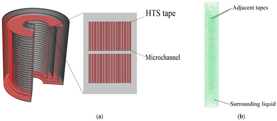 Microchannels between two tapes of HTS winding play a crucial role in heat transfer, especially under fault current conditions. Figure 4a shows the schematic structure of the windings of the HTS transformer, and Figure 4b shows the geometry grid and the independent mesh of the model.